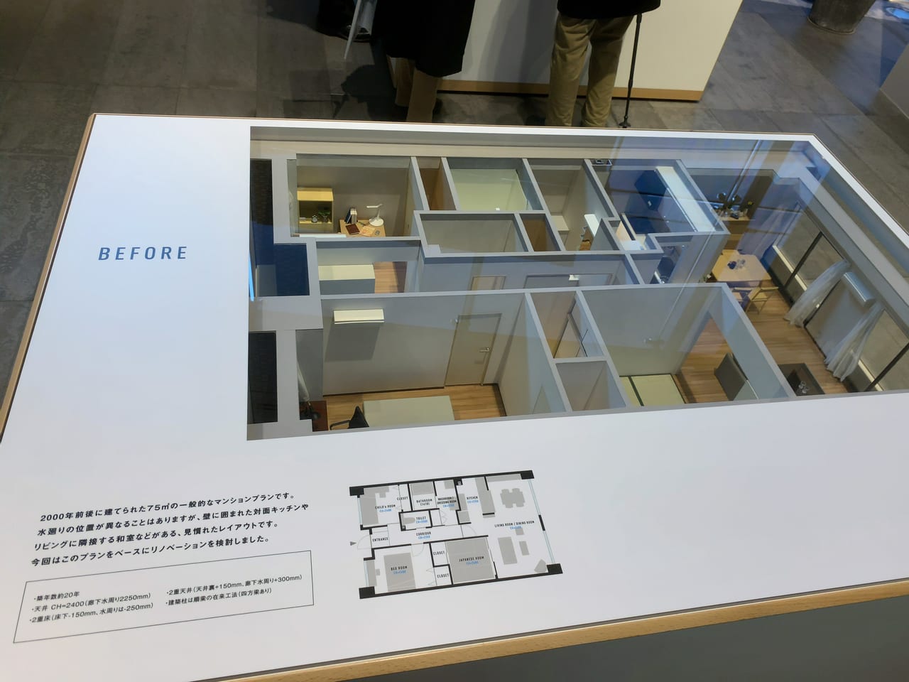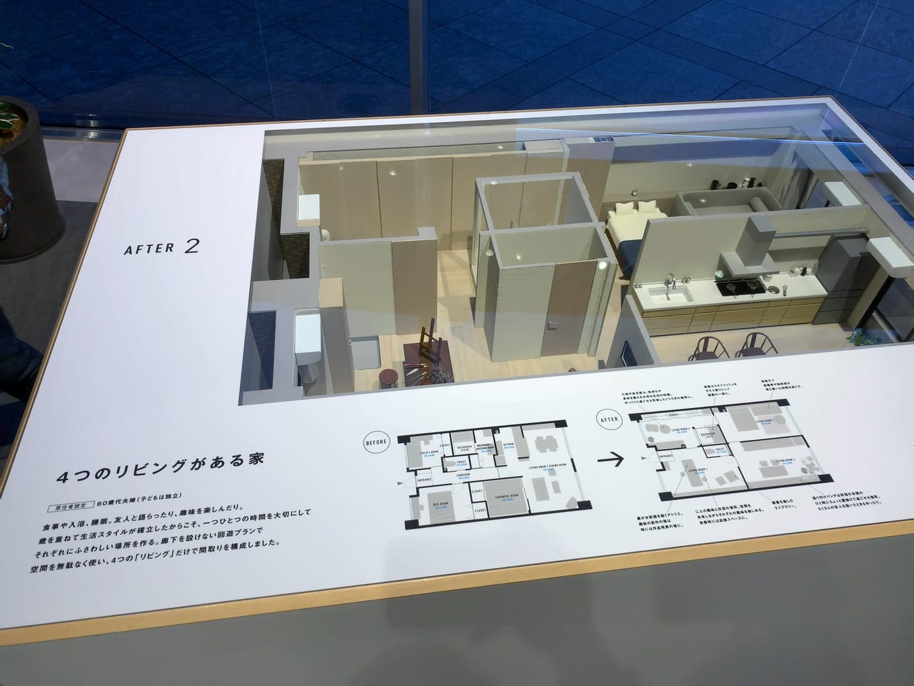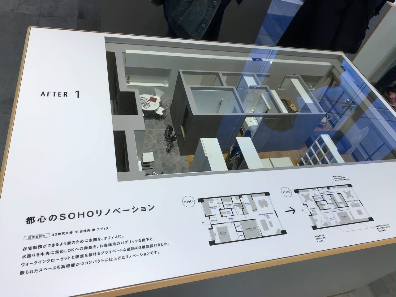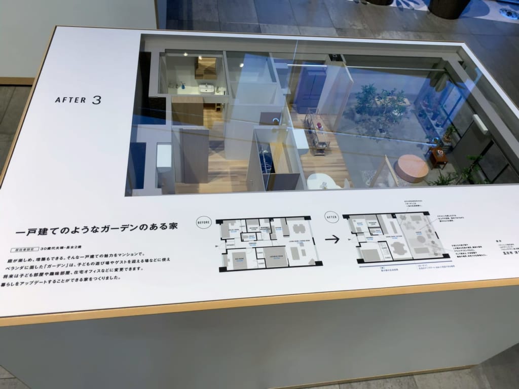 リノベーション事例のビフォー・アフターを1/10サイズの模型で説明されています。