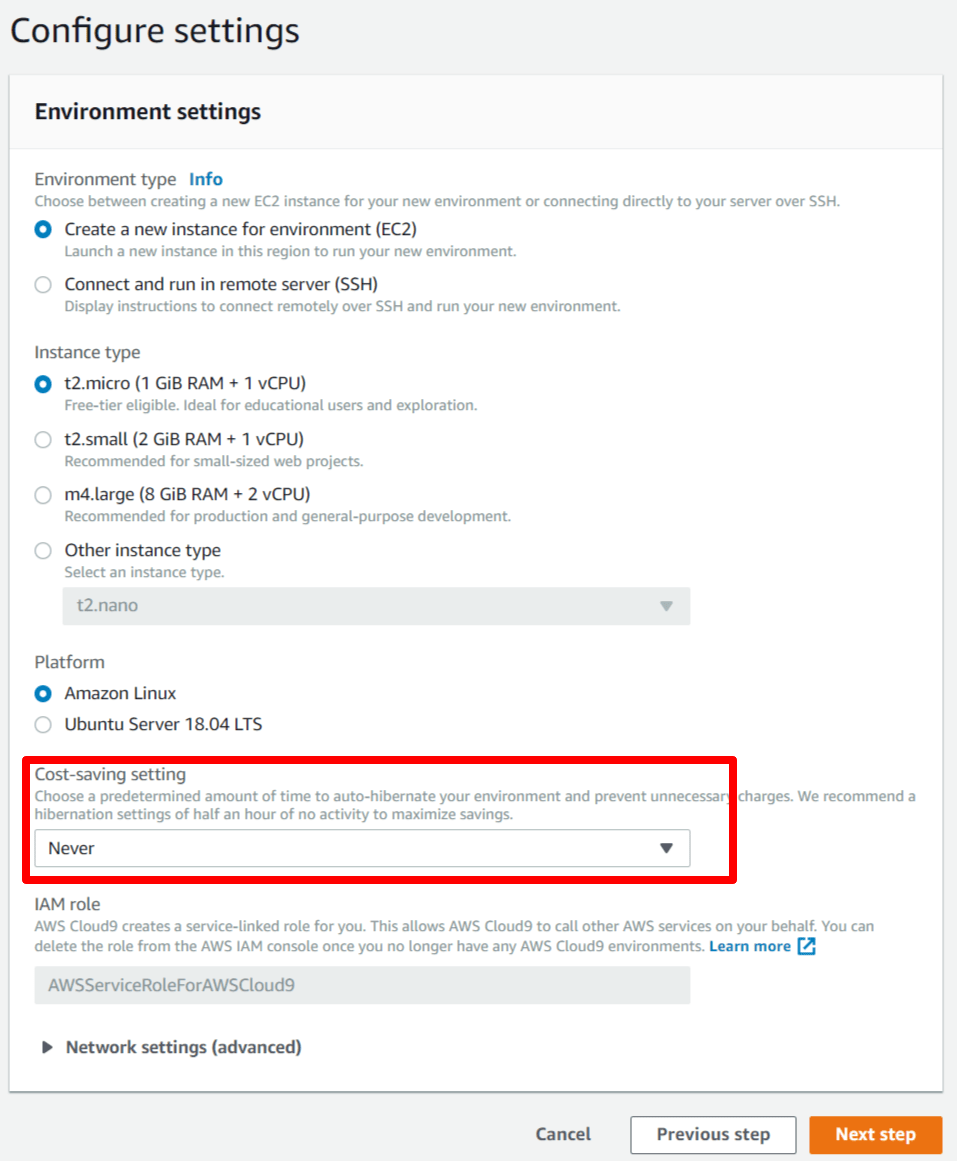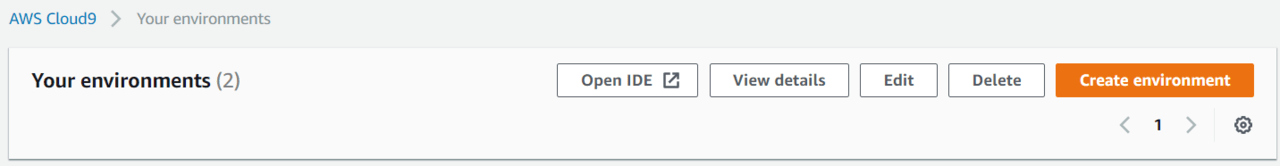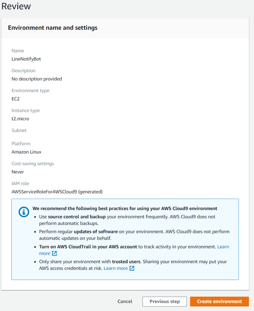 最後に設定の確認をしてCreate environmentでCloud9のインスタンスが作成されます。