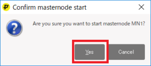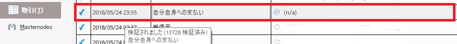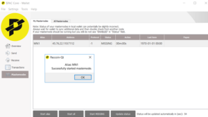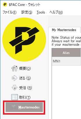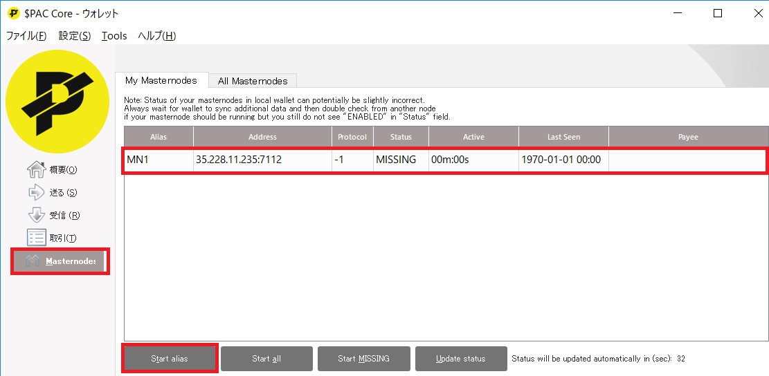 ウォレット左側メニューのmastenodeを開くとMN1が追加されています。 起動したいマスターノードをクリックして選択し、 Start aliasボタンを押すと、マスターノードが起動します。