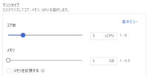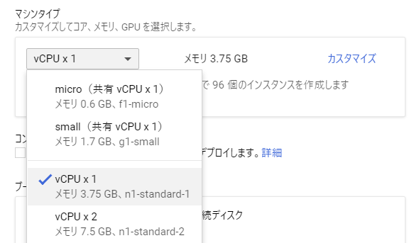 マシンタイプですが、一番下のmicroだとマスターノードの為のスペックが足りないというエラーが出た為、共有vCPUでないvCPU×1を選択しました。