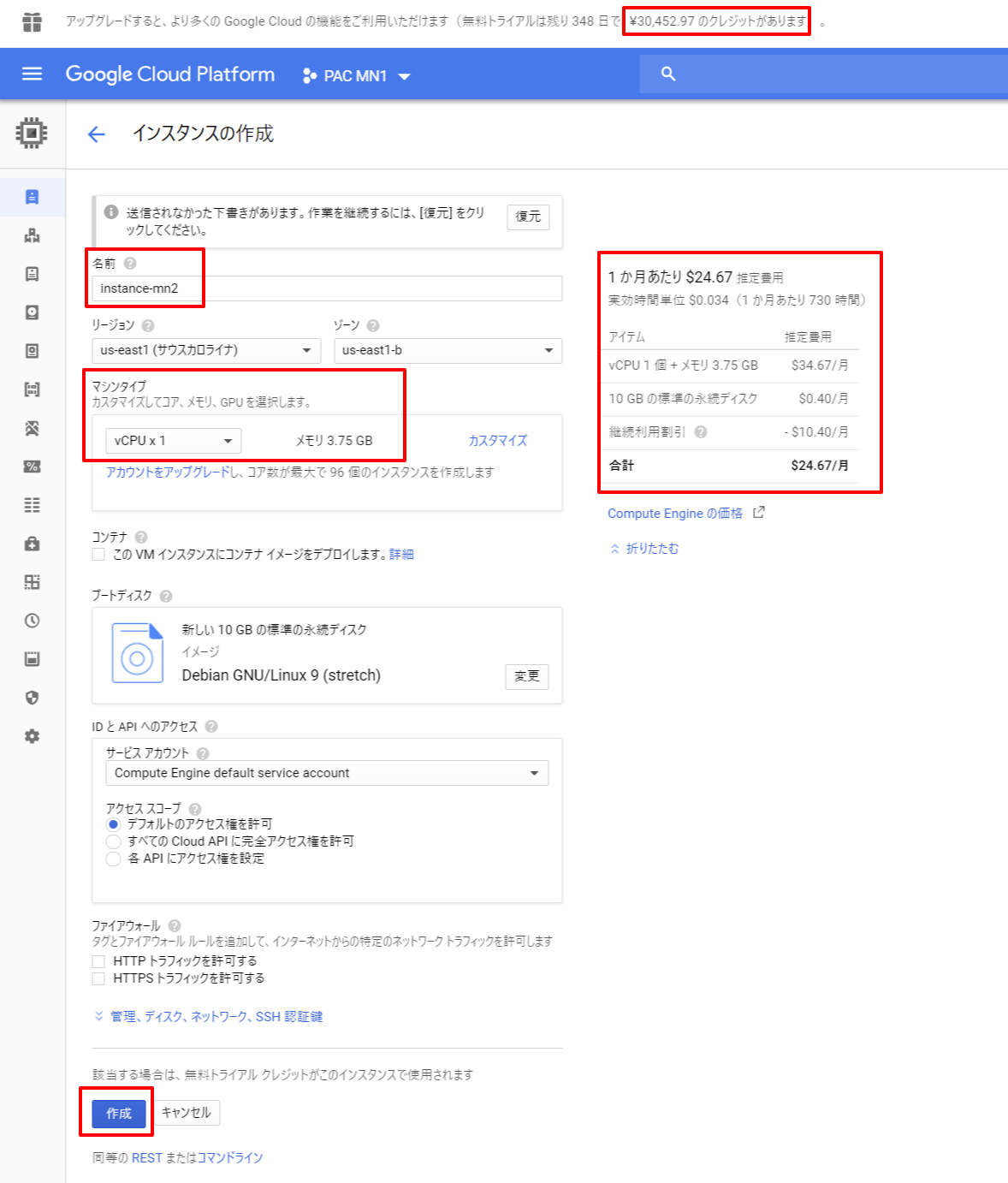 OSも特にこだわりが無ければデフォルトのDebian GNU/Linux 9(stretch)で問題ありません。 作成を押して完成です。