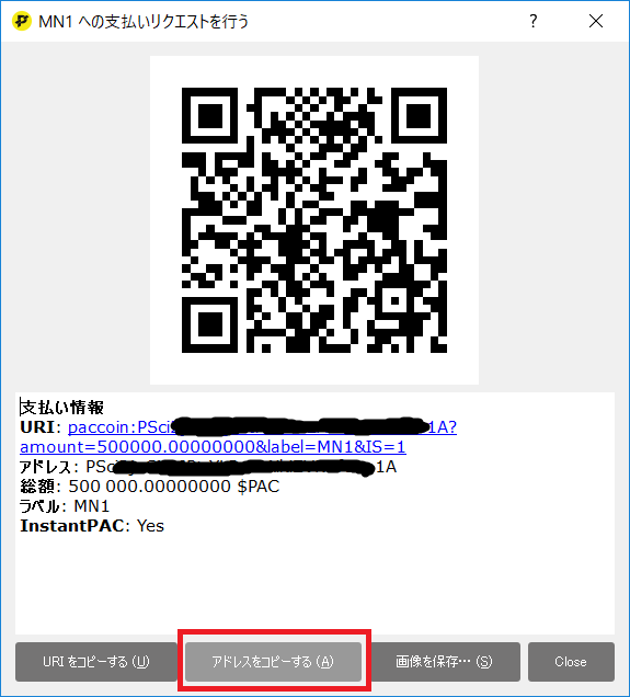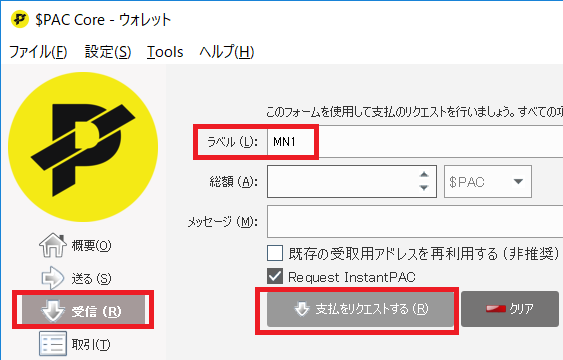 次にマスターノード用の500,000$PACを自分自身のウォレットアドレスに対して送信します。 左側メニューの受信を開いて支払いをリクエストするを押すとアドレスが表示されるので、アドレスをコピーします。 ラベルにはMN1、MN2などわかりやすい名前を付けておきましょう。