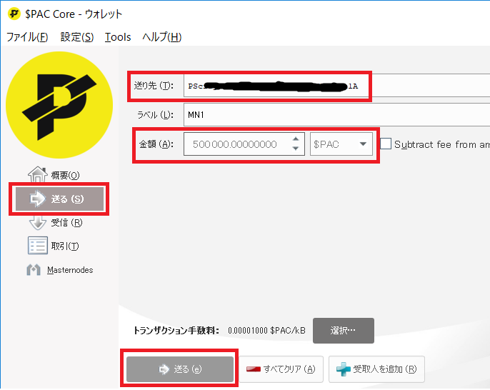 アドレスをコピーしたら左側メニューの送信を開いて送り先欄に貼り付け、500,000$PACを指定して送信します。