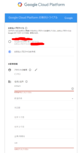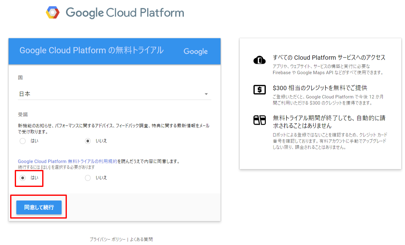 https://cloud.google.com/ GCPトップの「無料トライアル」から進んで規約に同意の項目で「はい」をチェックし、「同意して続行」ボタンを押して進めます。