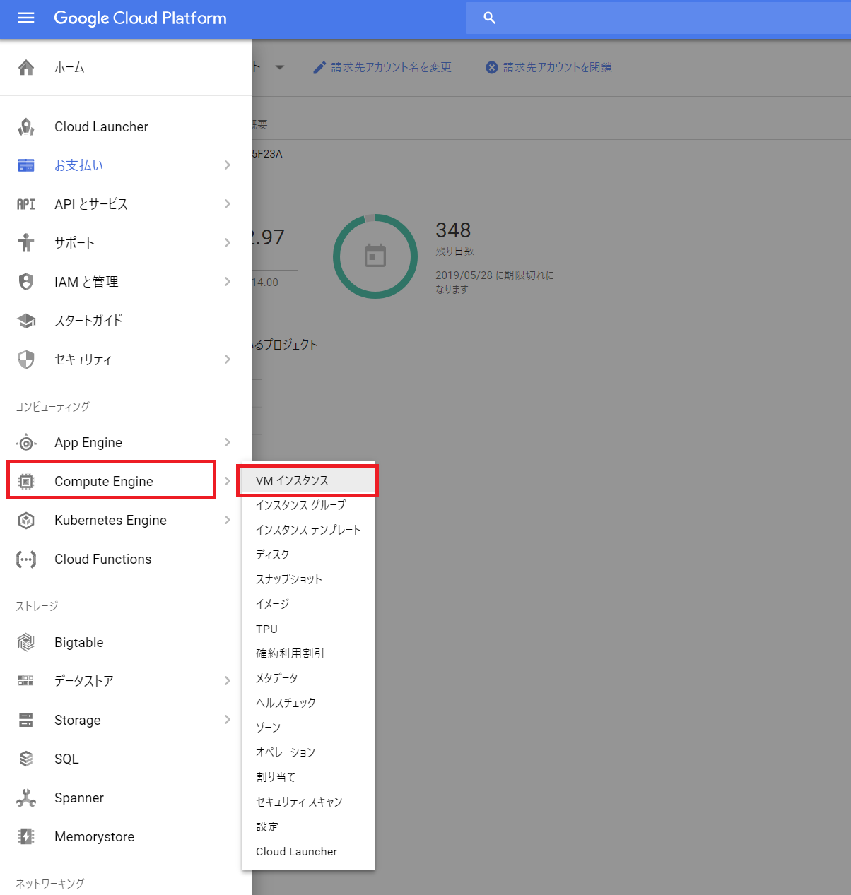 VPSは仮想サーバを作成する技術、VM(Virtual Machine)はその仮想サーバを指します。 作成されたVMの実体をVMインスタンスと呼びます。 では、VMを作成して行きましょう。 左上のハンバーガーメニューから Compute Engine -> VMインスタンス に移動します。