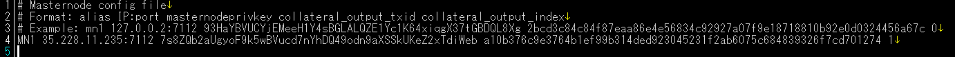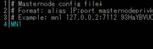 ※masternode.conf内の#記号が先頭にある行はコメント化され、無効となります。