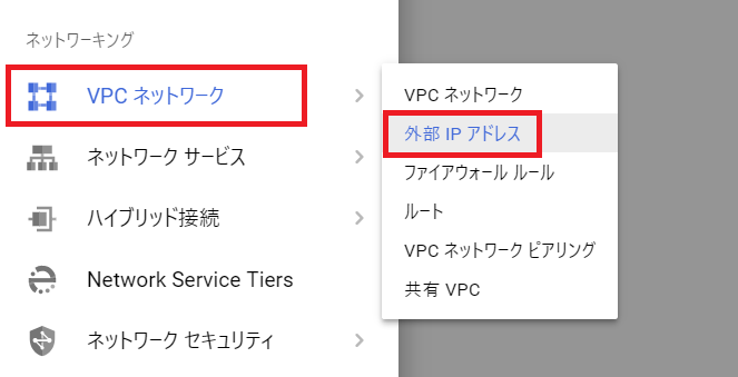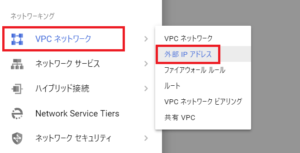 左上のハンバーガーメニューから VPCネットワーキング -> 外部IPアドレスを選択します。