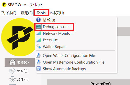 自身への500,000$PAC支払いステータスの承認が15を超えたら Tools -> Debug Console でコンソールを開き、以下のコマンドを入力します。