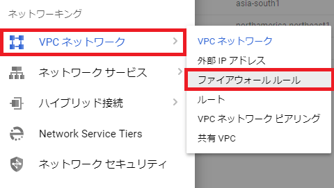 IPアドレスと同様にVPCネットワークの項目からファイアウォールルールを選択します。