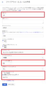 名前、ターゲット、ソースIPの範囲、プロトコルとポートの項目に入力し、作成します。