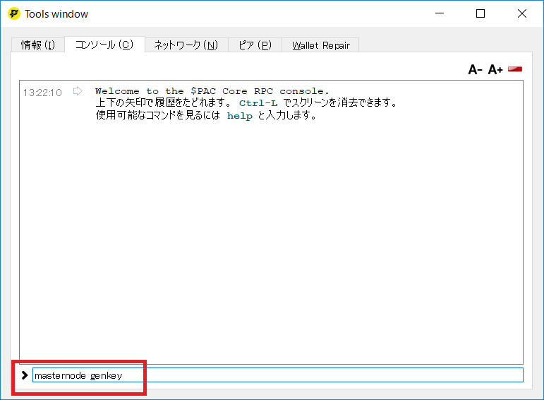 pacmn.shを実行するとIPアドレスを聞かれるので、作成したVMの外部IPアドレスを入力しましょう。 IPアドレスを入れるとウォレットで生成したgenkeyを求められるので入力します。