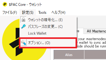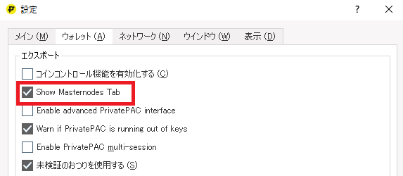 ウォレットはデフォルトではマスターノードのタブがメニューに表示されていません。 以下の手順で表示させます。 設定 -> オプション で設定画面を開き、ウォレットタブでShow Masternodes Tabにチェックを入れます。 ウォレットを再起動すると左側にMasternodesのタブが表示されるようになります。