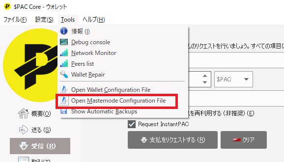 Tools -> Open Masternode Configuration File でマスターノードの設定ファイルを開きます。