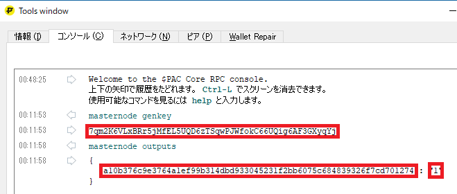 デバッグコンソールでgenkeyとTXIDを出力