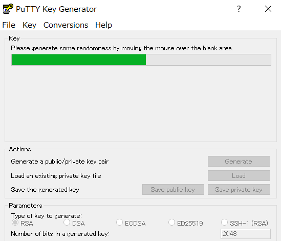 Parametersの部分がRSAにチェックされている事を確認してGenerateを押したらプログレスバーの下の空白部分でマウスをグリグリ動かしてください。