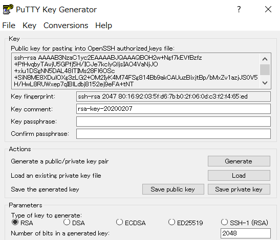 Save public key(任意)とSave private key(必須)を押してそれぞれ保存しておきましょう。
