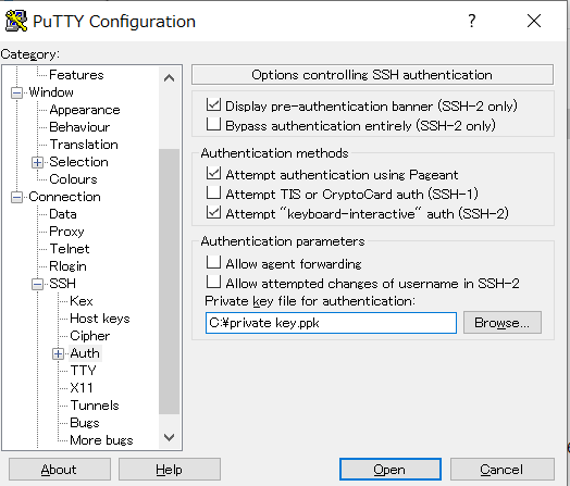 SSH->Authを選択し、Private key file for authenticationに保存したSSHのprivate key(xxx.ppk)のパスを入力します。