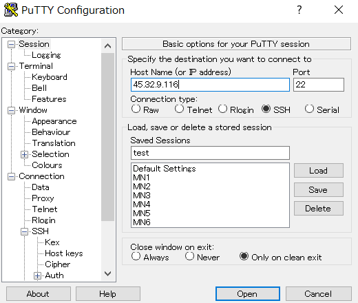 Sessionの項目を選択し、先程確認したVPSのIPアドレスを入力し、Port22になってSSHにチェックが入っていれば準備OKです。