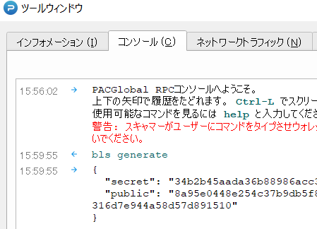 デバッグコンソールにbls generateを入力するとsecretとpublicの2つのキーが生成されます。