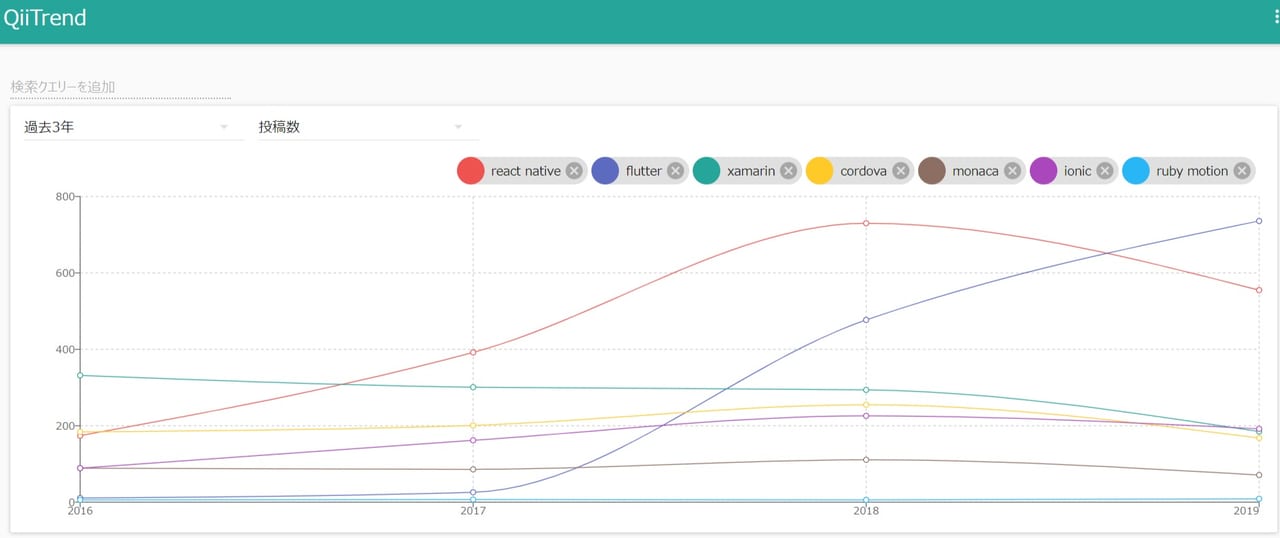 世間でのクロスプラットフォーム、ハイブリッドアプリの人気を調べる為、Google Trendとqiitrendで調べました。