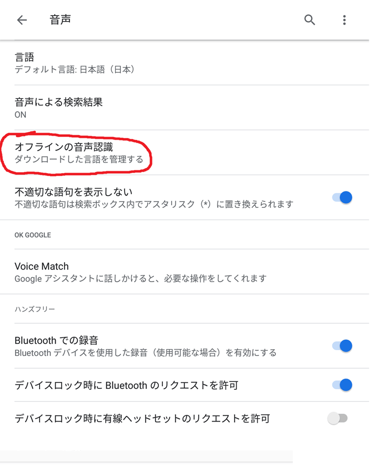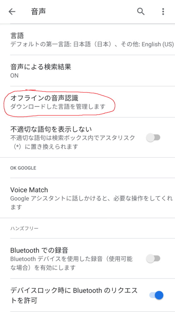 設定 -> システム -> 言語と入力 -> 仮想キーボード -> Google音声入力 -> オフラインの音声認識