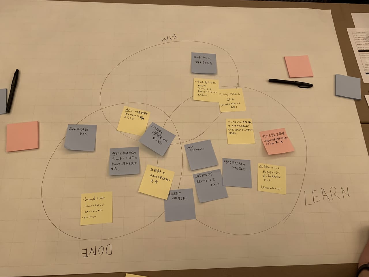 各チームFUN/DONE/LEARNを書き、付箋を貼っていきます。