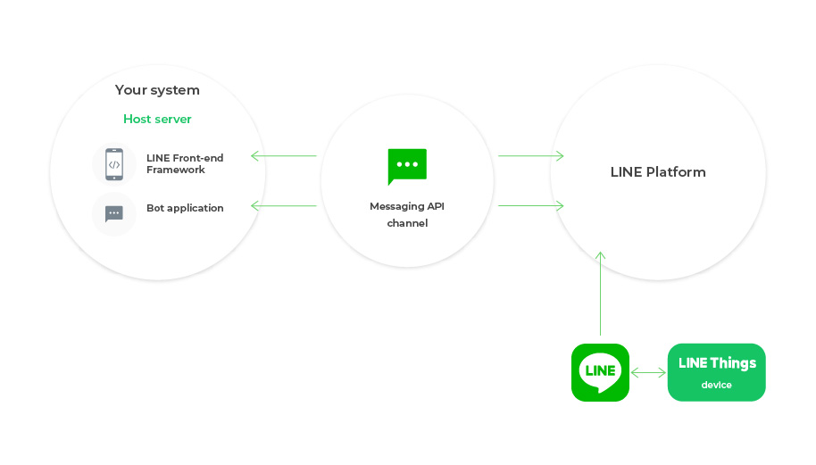 この図のようにビジネスアカウント(Messagin API Chanel)、自分のシステム(LIFFアプリ、Bot)、LINEアプリ、LINE Things対応デバイス(BLE搭載)で構成されます。