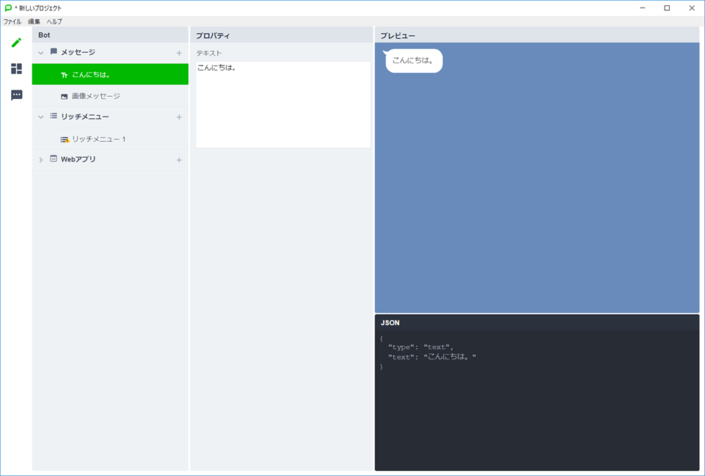 ここで作成したメッセージのJSONコードは実際にBotを開発する事に利用できます。