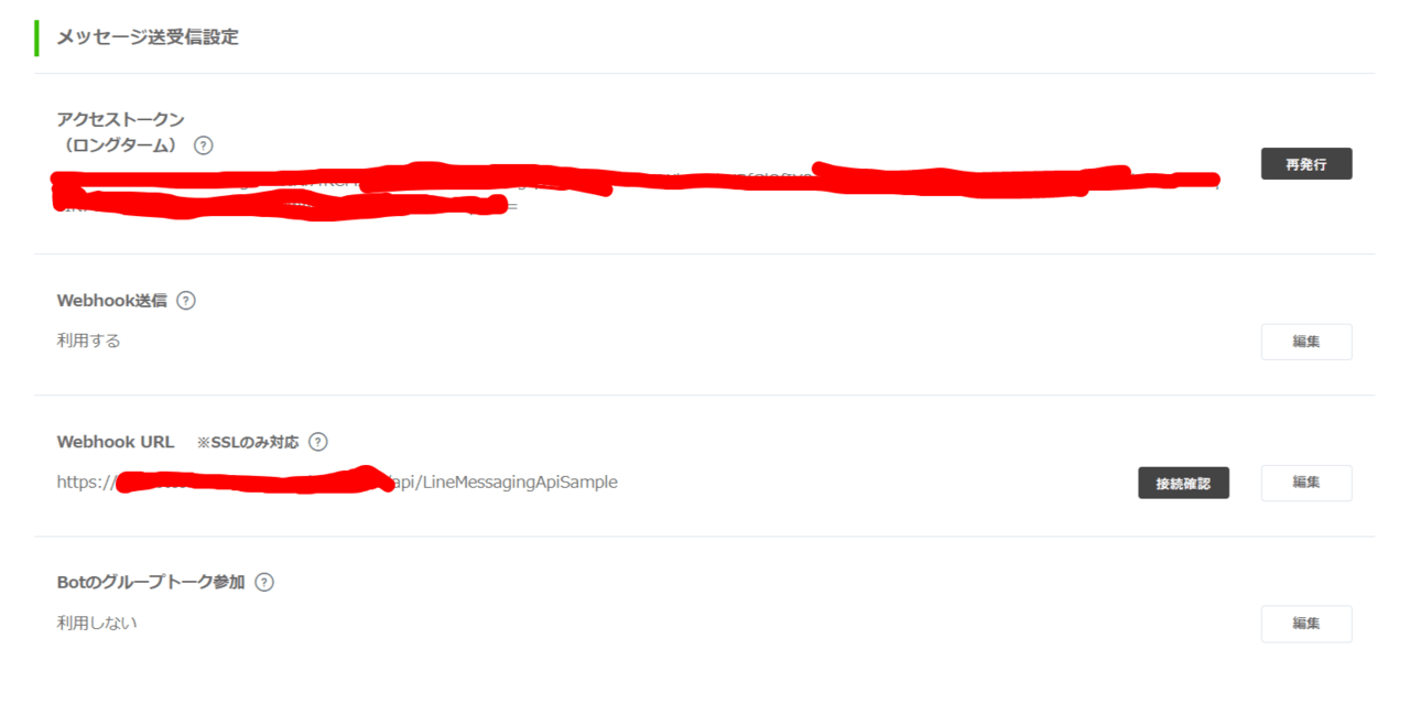 Webhook URLの設定はLINE Developersのチャネル基本設定のメッセージ送受信設定で行います。
